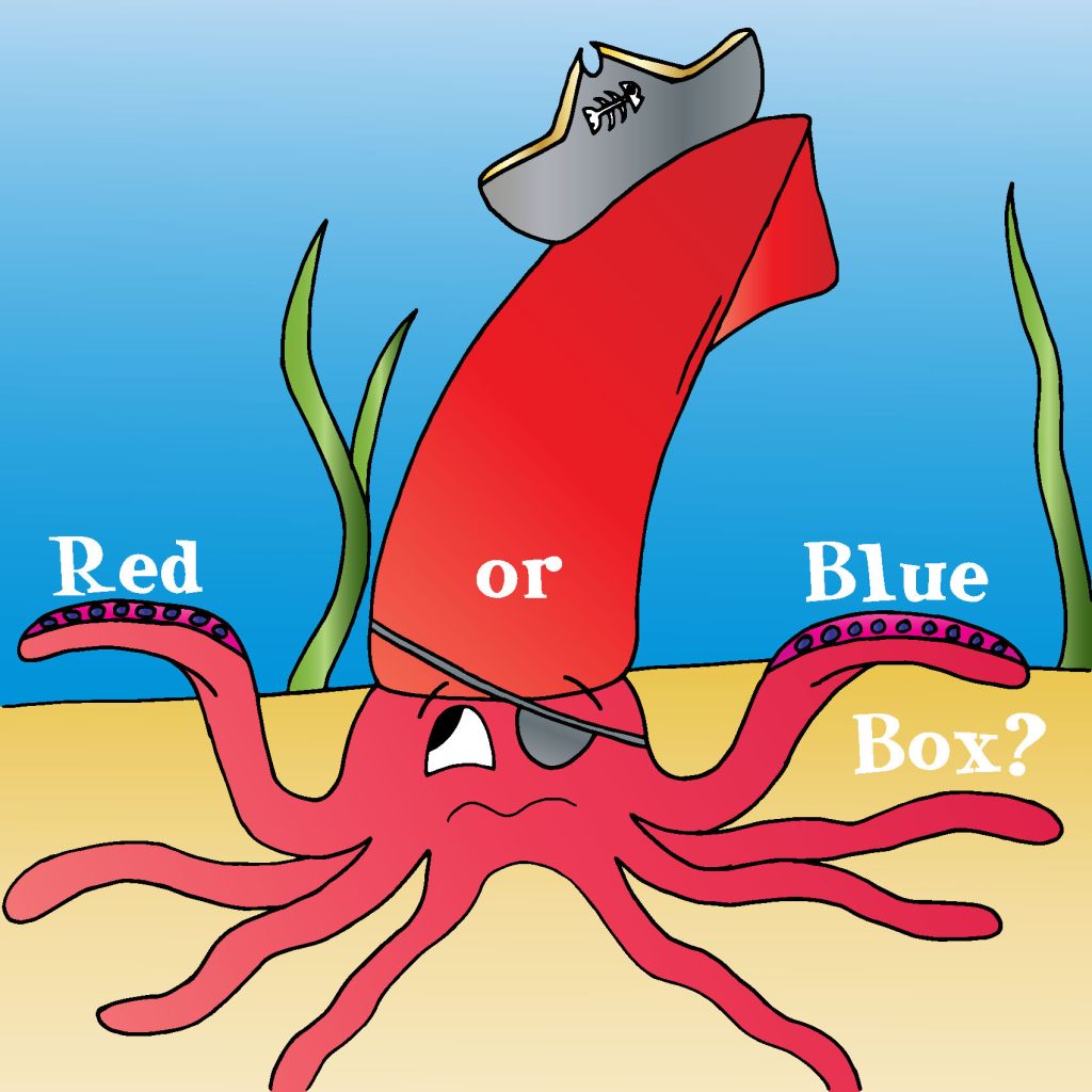 The story of a pirate squid that is trying to figure out if a box is red or blue. He asks many sea creatures but no one knows the answer, until Stingray asks the one question no one else has asked.